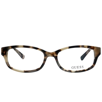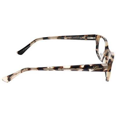 These Guess GU 2429 PKTO unisex rectangle eyeglasses, feature a beige tortoise plastic frame and demoes. Size and dimensions for the Guess model GU 2429 are lens 52mm x bridge 16mm x temple 135mm. This frame will come with Guess case, cloth and paperwork, and they can be fitted with your prescription by your eye doctor.