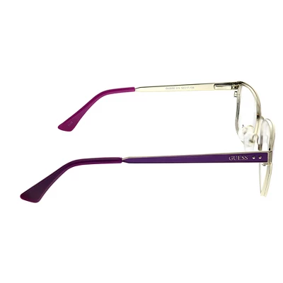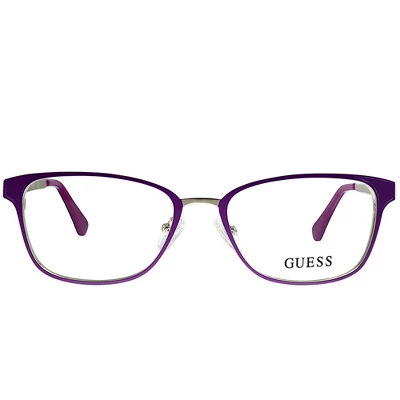 These Guess GU 2550 076 unisex rectangle eyeglasses, feature a purple metal frame and demoes. Size and dimensions for the Guess model GU 2550 are lens 52mm x bridge 17mm x temple 135mm. This frame will come with Guess case, cloth and paperwork, and they can be fitted with your prescription by your eye doctor.