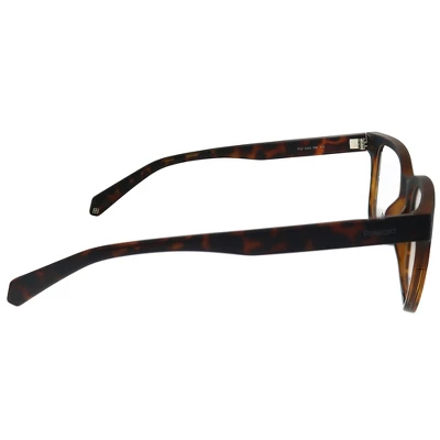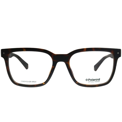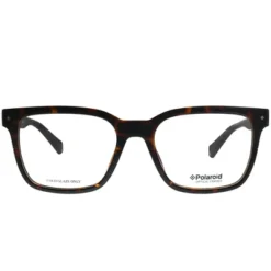 These Polaroid PLD D343 086 unisex square eyeglasses, feature a dark havana plastic frame and demoes. Size and dimensions for the Polaroid model PLD D343 are lens 52mm x bridge 18mm x temple 145mm. This frame will come with Polaroid case, cloth and paperwork, and they can be fitted with your prescription by your eye doctor.