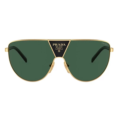 These Prada PR 69ZS 5AK05V unisex shield sunglasses, feature a gold metal frame and green lenses. Size and dimensions for the Prada model PR 69ZS are lens 37mm x bridge 137mm x temple 130mm. This frame will come with Prada box, case, cloth and paperwork.